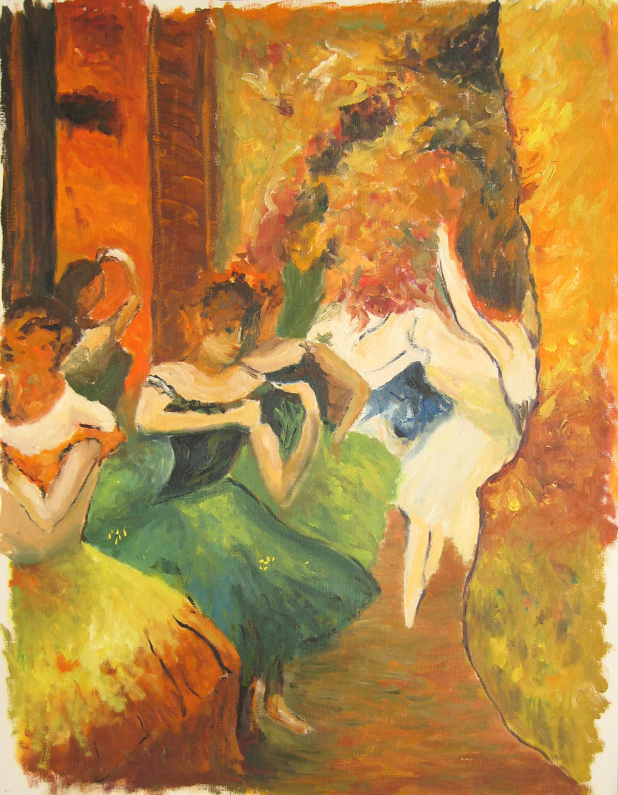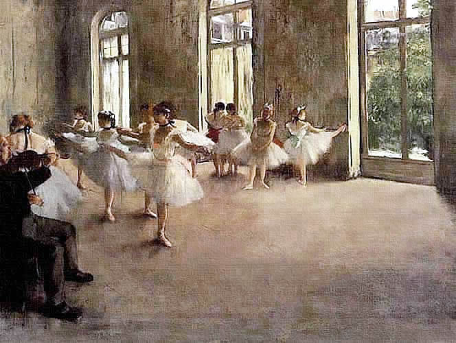 Tras la guerra franco-prusiana, en la que participó alistándose en la Guardia Nacional, Degas regresó a París y frecuentó el ballet de la Ópera de la calle Peletier, iniciando sus primeras y míticas series de bailarinas hacia 1872. Dos años después, cuando participó en la primera muestra impresionista, su pintura fue una de las menos criticadas debido al perfecto dominio del dibujo, entendido éste sólo como un análisis de la realidad.