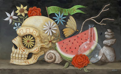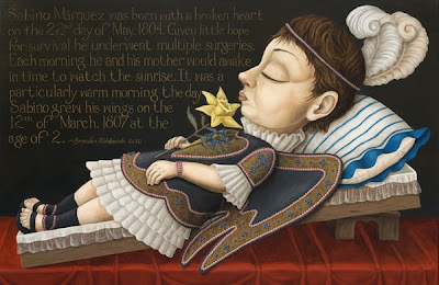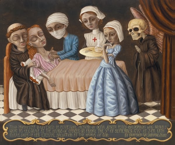 Brandon Maldonado was born in 1980. He resides in Albuquerque, New Mexico, an environment rich in hispanic arts and culture. As a child, he was introduced to the fantastical realm of Star Wars and the monsters of Michael Jackson’s Thriller, which first sparked his artistic imagination. In his teens he turned to graffiti, an influence that still can be seen in his works to this day. Maldonado holds a bachelor’s degree in liberal arts from the College of Santa Fe with a focus in Philosophy and world religion he also holds an associate’s degree in fine art but considers himself to be a primarily self taught artist whose most essential technical development was based on the independent study of the paintings of the old masters including Jan Van Eyck and Dominique Ingres among others.
